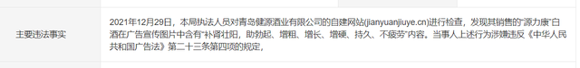 2021年12月29日,胶州市市场监督管理局执法人员对青岛健源酒业有限公司的自建网站(jianyuanjiuye.cn)进行检查,发现其销售的“源力康”白酒在广告宣传图片中含有违法内容。青岛健源酒业有限公司上述行为涉嫌违反《中华人民共和国广告法》第二十三条第四项的规定。